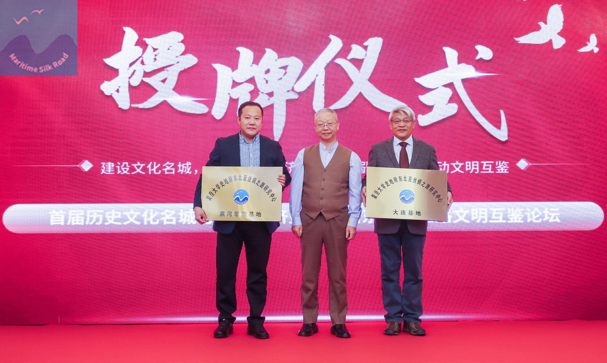 与会期间,樊主任代表本中心,向复旦大学史地所东北亚丝绸之路研究中心大连基地、黑河学院基地正式授牌。本中心特聘研究员、大连基地负责人王禹浪教授,黑河学院党委副书记姜国玉教授,一同参加了授牌仪式。